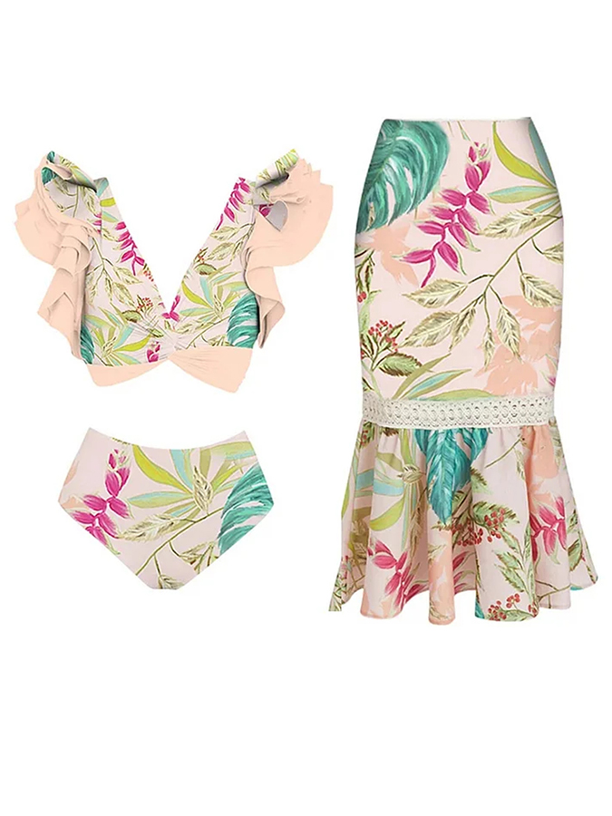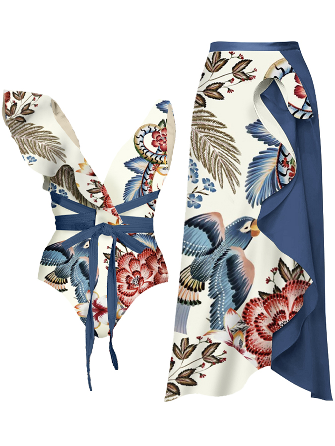 Vintage V Neck Ruffle Floral Print Swimsuit and Skirt