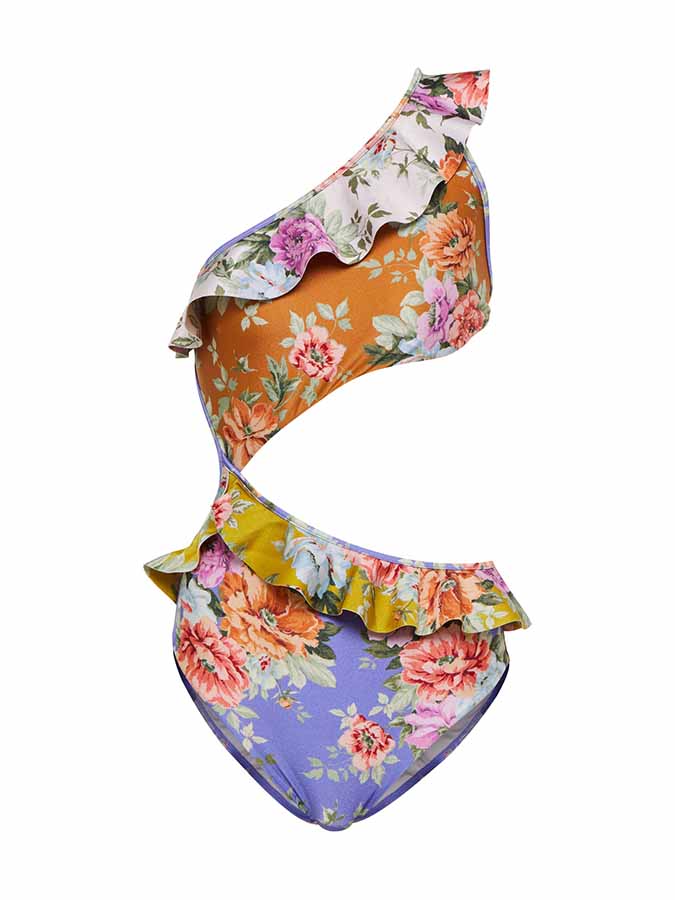 Cutouts at the waist and a one-shoulder design give this swimsuit a head-turning asymmetric silhouette, while colorful bands of flowers add tropical flair.
