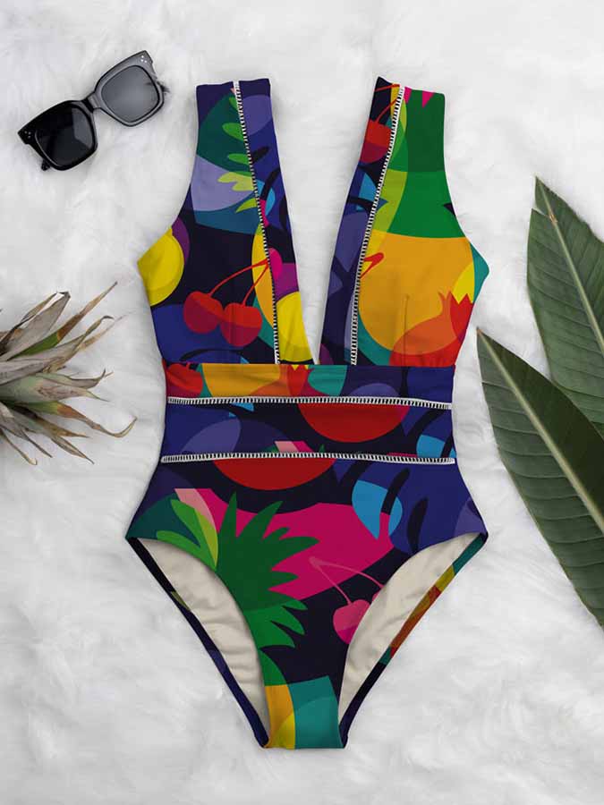 Fashion Colorblock Print Deep V Neck One Piece Swimsuit