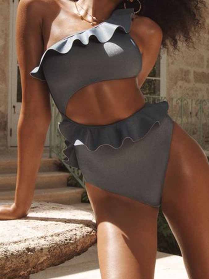 One-Shoulder Ruffle Solid One-Piece Swimsuit