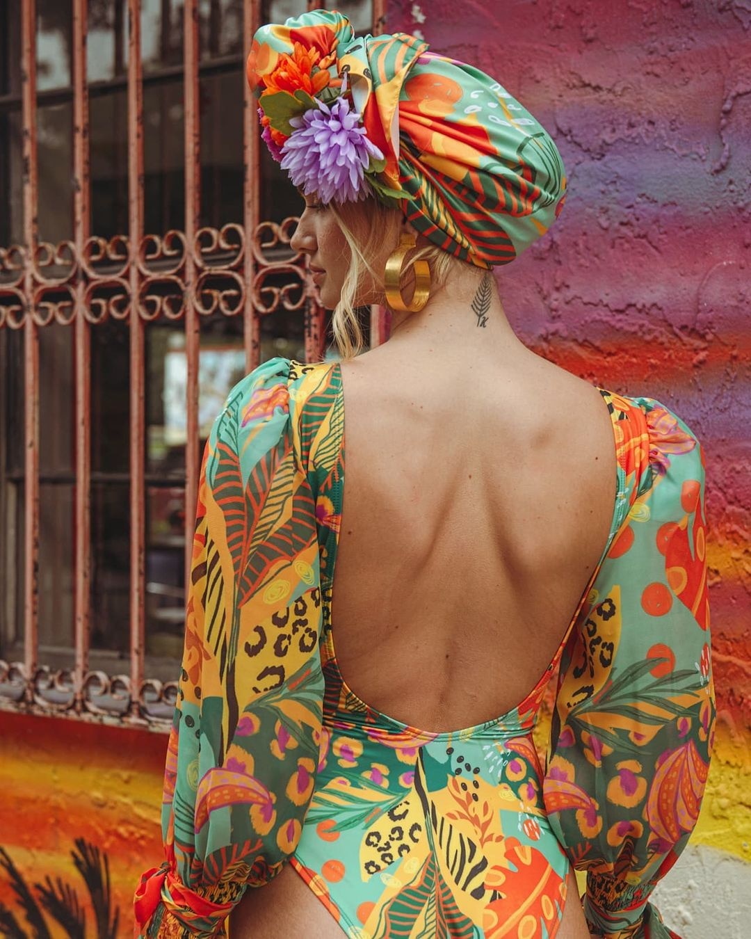 Long Sleeve Printed Backless One Piece Swimsuit